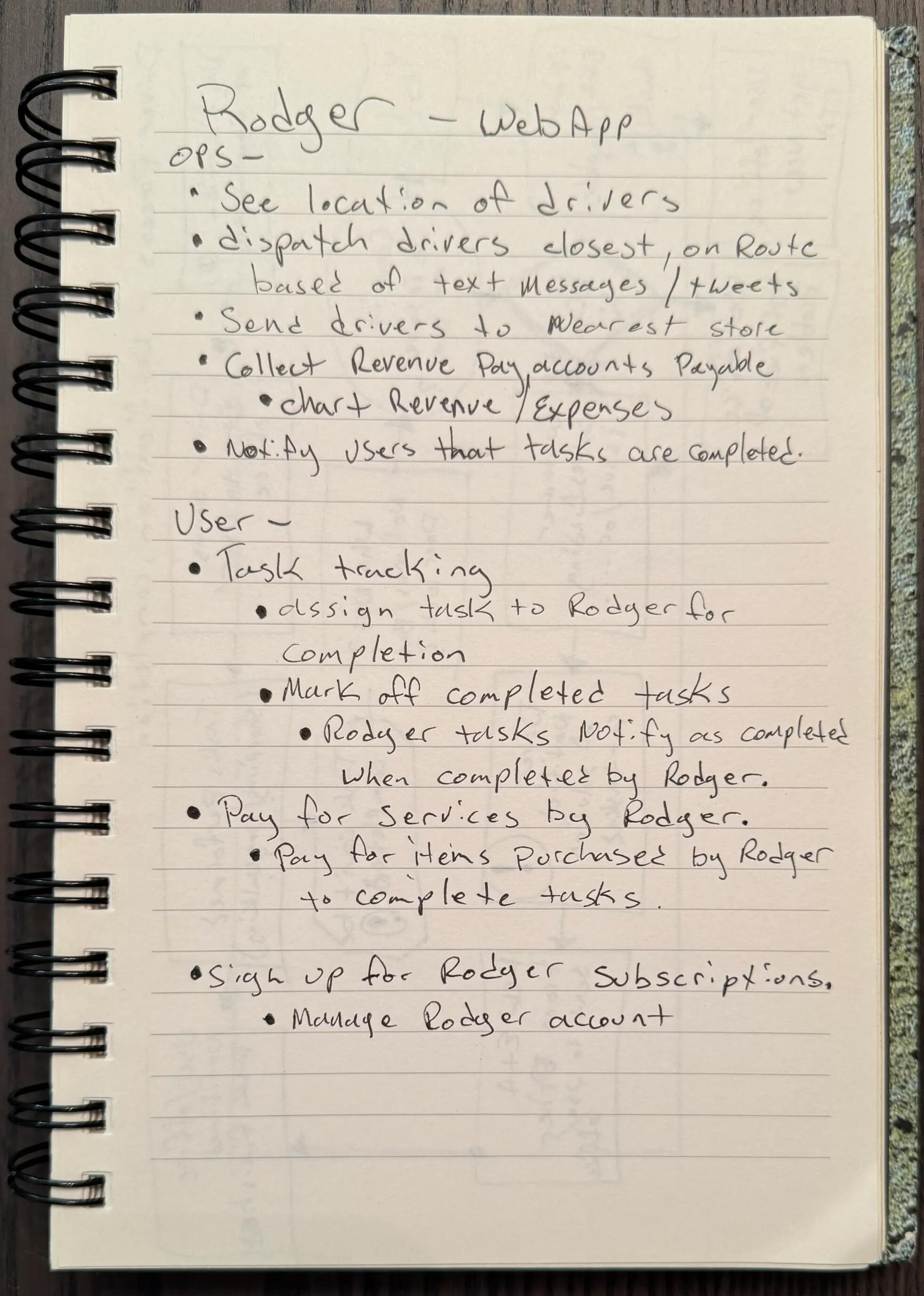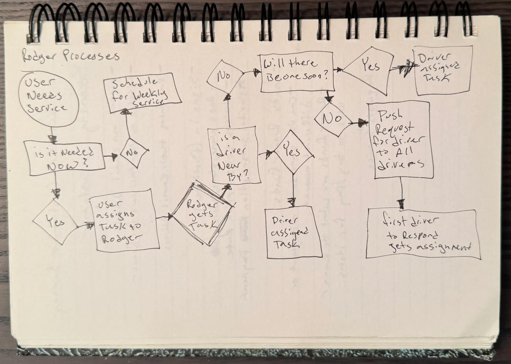 Rather than starting with screens, I mapped the underlying service logic first: how requests move through the system, how roles interact, and how breakdowns are handled when real-world conditions inevitably disrupt ideal flows.Rodger was a concept exploration in real-time coordination, designed years before gig work became app-based. The goal was to imagine a dispatch and task-tracking system that could scale without losing clarity, accountability, or human judgment.The result was a role-aware dispatch model built around communication, clear handoffs, and decision support rather than blind automation.